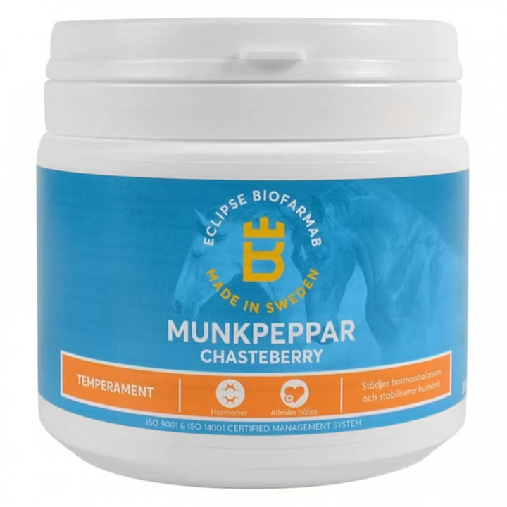 Eclipse Biofarmabs Munkpepper er et høykvalitetsprodukt basert på 100% malt munkpepper (Vitex Agnus-Castus). Den er spesielt utviklet for å støtte hormonbalansen hos hopper, hingster og vallaker. Produktet inneholder ingen tilsetninger og er produsert med fokus på best mulig opptakbarhet.